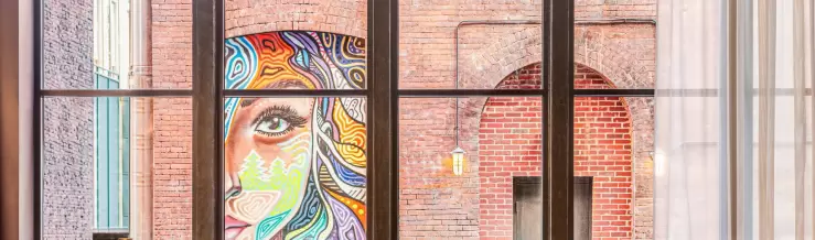 Enjoy curated artwork, large windows, and custom furnishings in a 322 sq. ft. room that boasts touches of the building's past. A comfortable king bed, desk area, and bright bathroom with a glass enclosed shower and gleaming fixtures create your Nashville home base.